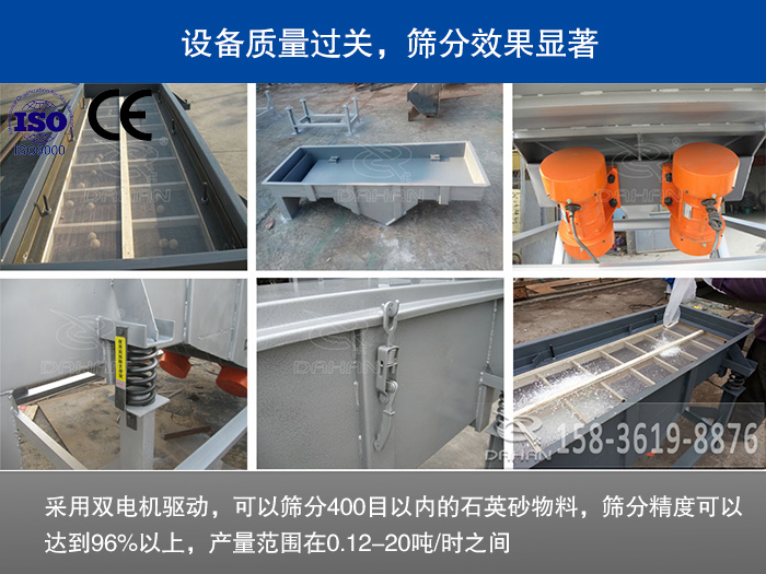大漢石英砂篩分機采用雙電機驅(qū)動,可以篩分400目以內(nèi)的石英砂物料,篩分精度可以達到96%以上,產(chǎn)量范圍在0.12-20噸/時之間。另外,我們的設(shè)備可以有單層或多層設(shè)計,既可以滿足石英砂用戶的除雜需求,也可以解決石英砂多層分級問題,篩分效果非常好。